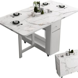 Folding Dining Table with Rack and 2 Storage Drawers, Movable Extendable Space Saving Kitchen Table in 3 Forms (White)